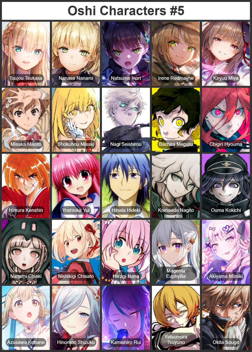 | Danganronpa series | HajimeChiaki ShuichiKaede MahiruHiyoko | NaegiKyouko, KomaruTouko, KaitoMaki, KiiboKokichi, NaegiSayaka, SoniaGundam, KokichiHimiko, TenkoHimiko, FuyuhikoPeko |