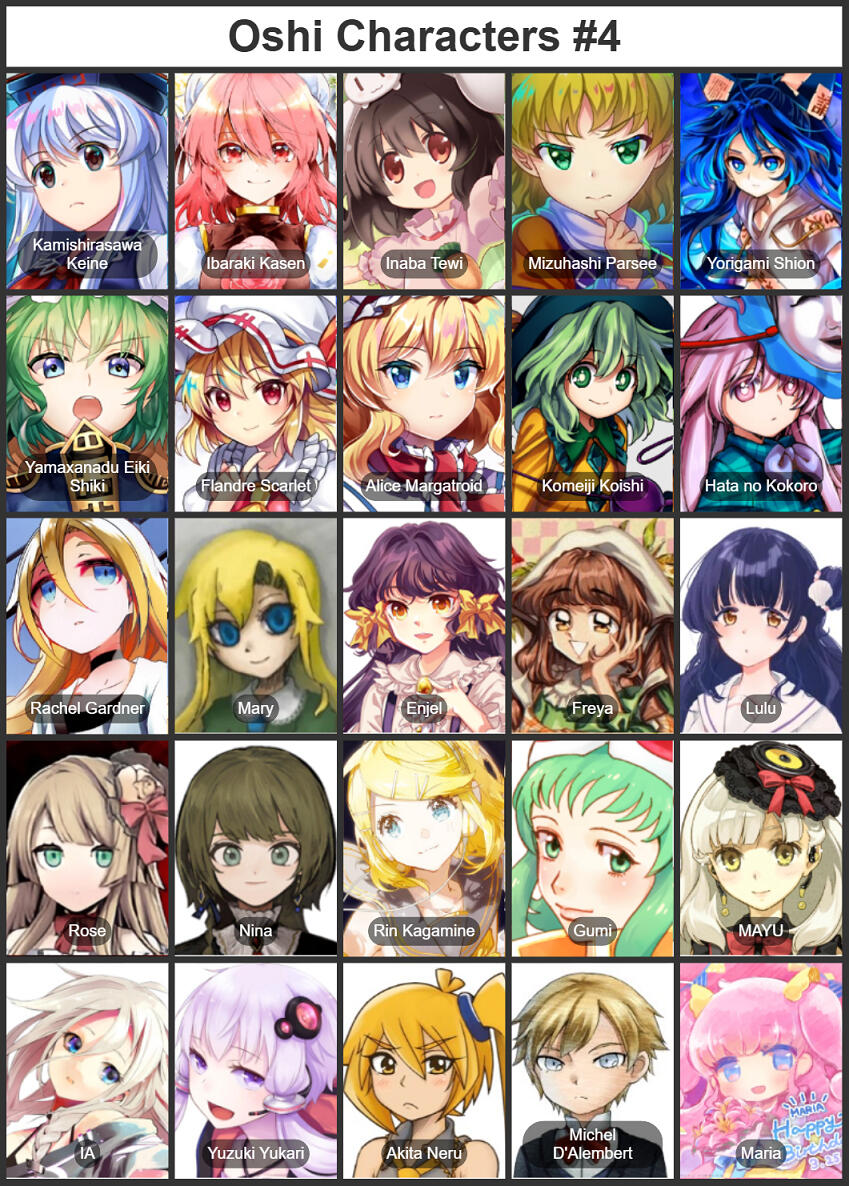 | Touhou Project | MokouKeine YuugiParsee ReisenTewi, MataraLarva | YuyukoYoumu, HinaNitori, SanaeKogasa, TenshiShion, MarisaAlice, YukariReimu, SakuyaRemilia, KoishiHatanokokoro, JunkoHecatia, EirinKaguya, RenkoMaribel, AyaMomiji, DaiyouseiCirno, MystiaKyouko, AkyuuKosuzu |